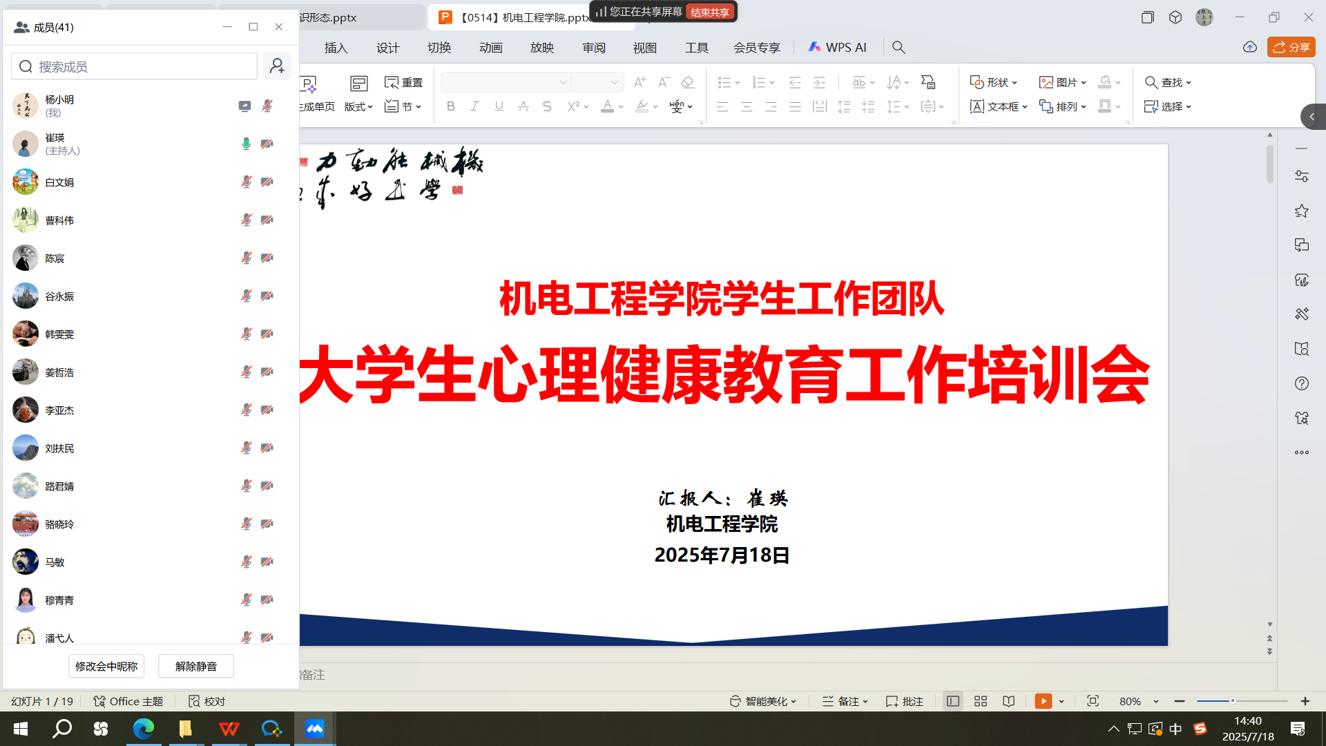 为持续夯实学生心理健康教育工作基础,凝聚育人合力,718日,机电工程学院以线上会议的形式召开班主任、辅导员心理工作专题会。会议由学院心理工作站站长崔瑛主持,学院党委副书记兼副院长杨小明、学院班主任和辅导员参与,围绕本学期心理健康教育工作复盘、暑期学习资源分享等内容展开交流。