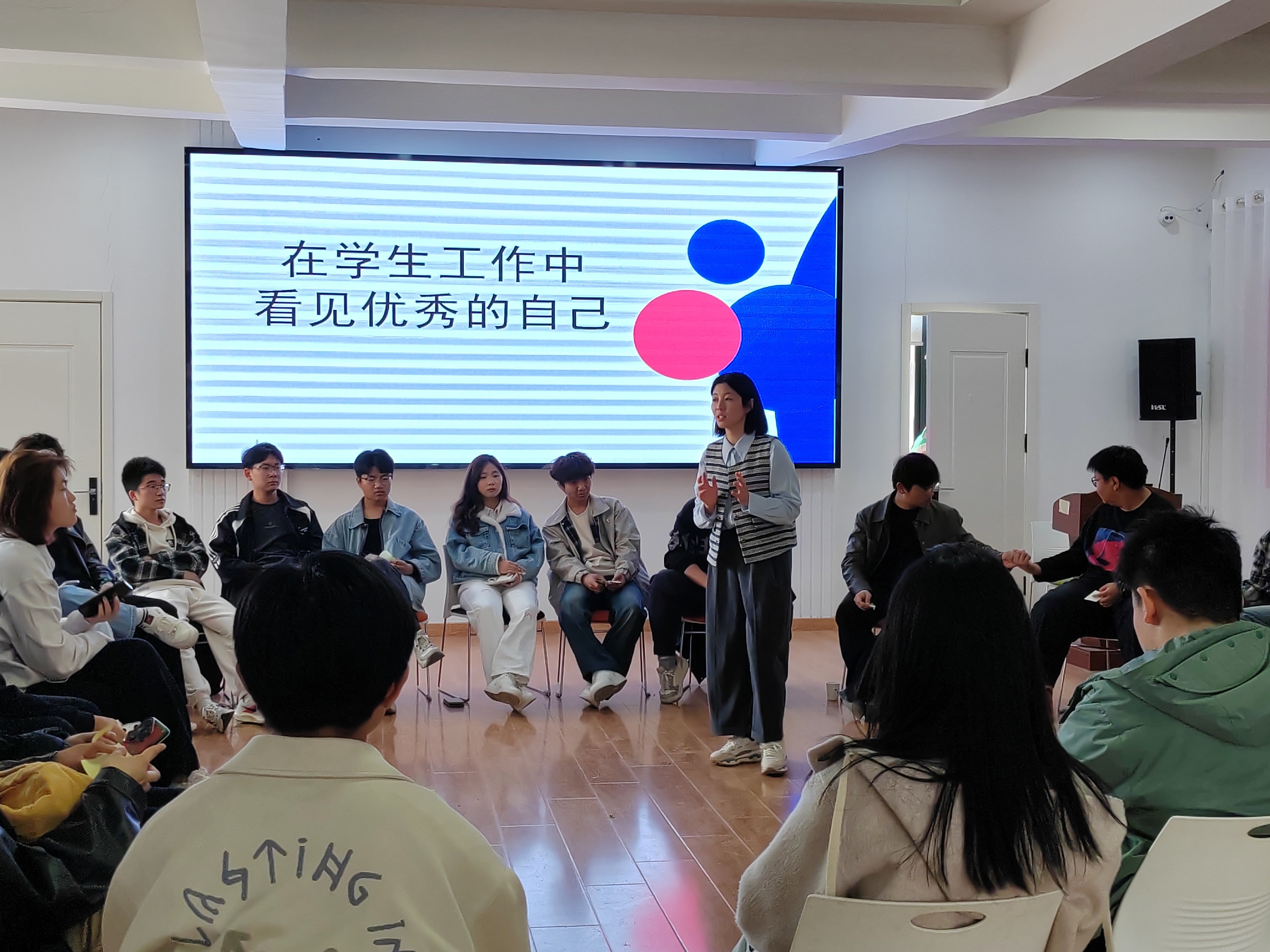 活动在刘璐老师的引导下有序展开。“破冰游戏”环节,学生利用与自己最相像的动物进行自我介绍,这一新颖的方式不仅迅速拉近彼此的距离,打破陌生感,更为后续的活动奠定良好的基础;“国王与天使”角色分配环节,学生互为“国王”与“天使”。通过作为“国王”收到来自“天使”的匿名鼓励与支持、作为“天使”默默关注并帮助自己的“国王”,感受到来自团队的温暖和关怀,体验了在团队中默默付出、用行动传递快乐的真谛,深刻体会到如何在团队中扮演好不同角色,为班级的发展贡献力量;“分享学生工作成就故事”环节,学生利用STAR模型回顾并分享学生工作的收获与成长,通过“情境重现—目标拆解—行动复盘—成果总结”,深度剖析在学生工作中的关键成长节点,从班级管理困境突破、活动策划创新破局到矛盾调解生态重构,逐步明晰个人优势与能力发展路径,深刻体悟到自身在学生工作中的责任与担当,更深刻理解了“个人成就团队,团队托举个人”的共生哲学。