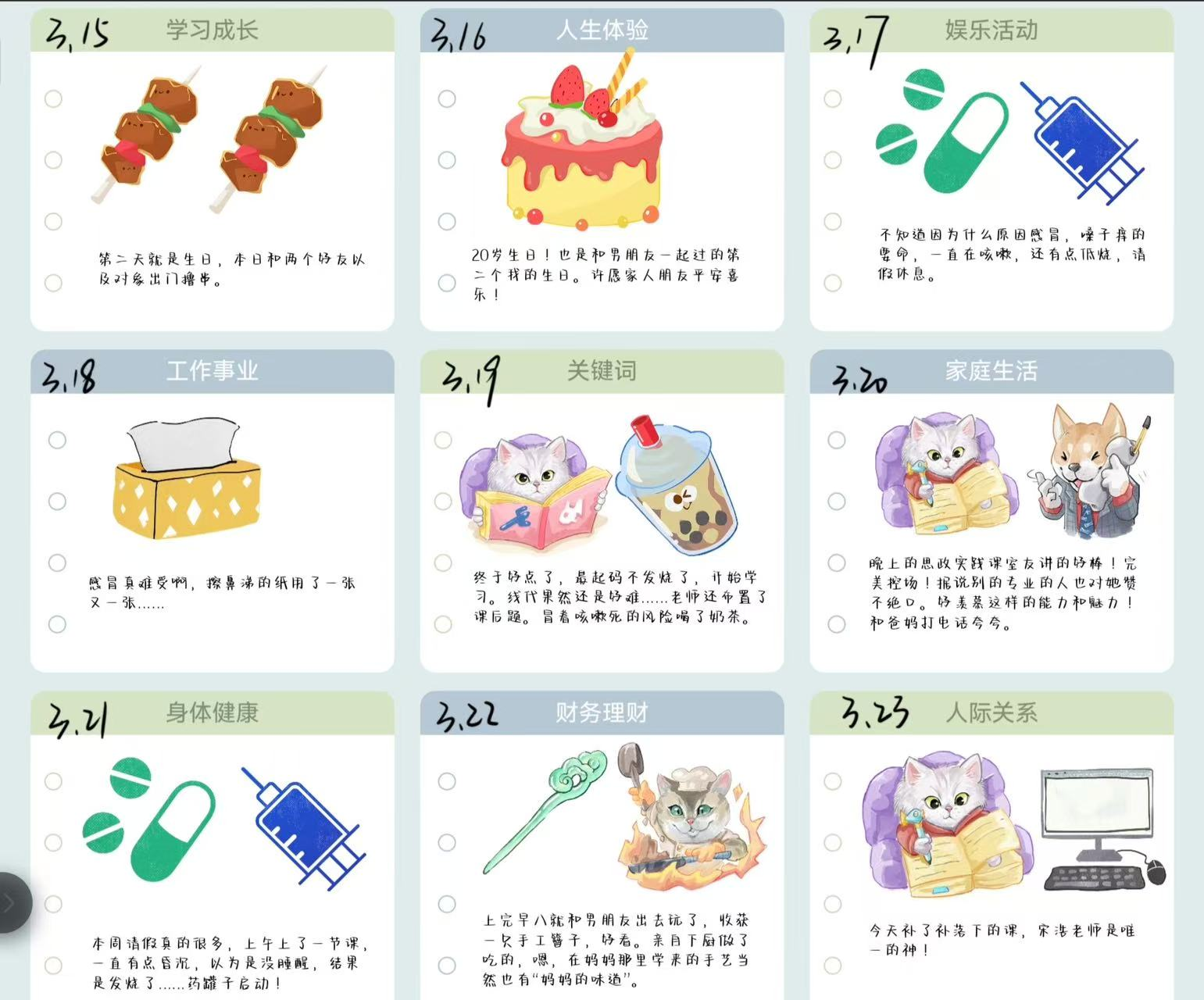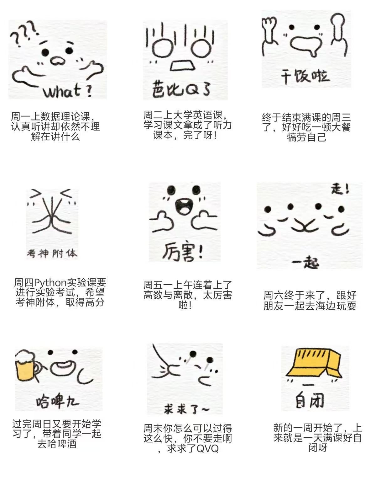 此次活动以 “心理涂鸦日记” 为核心载体,鼓励学生使用手机或平板绘制九宫格心情画板。活动中,学生需每日选取一个表情贴纸,并配以一句话来记录当天的情绪变化。这种图文并茂的方式,不仅使得抽象的情绪得以具象化表达,还有助于学生在记录过程中整理思绪,更加深入地了解自己的情绪状态,促使他们在忙碌中停下脚步,去发现和珍惜那些容易被忽视的生活美好瞬间。