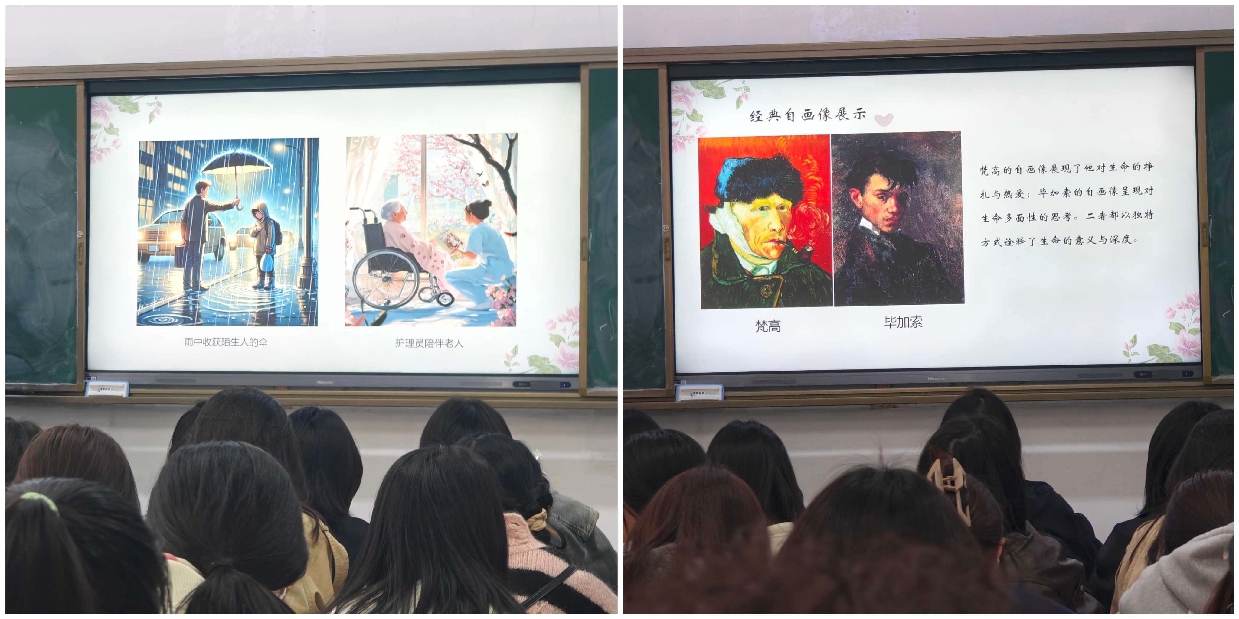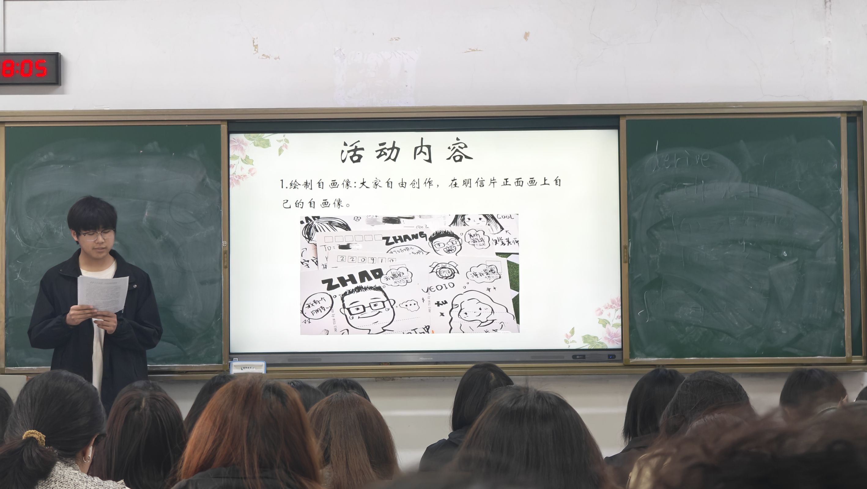 活动在主持人深情的开场词中拉开帷幕。“善意是照亮人生的微光,更是连接心与心的纽带。”简短而有力的引言后,现场播放的短片以真实案例再现善意传递的动人场景。在艺术赏析环节,经典自画像作品成为特别“导师”,主持人带领观众解读画作背后的生命哲思。“艺术家用画笔袒露灵魂,我们何不用真诚开启心门?”在主持人的引导下,学生们开始用彩笔在明信片正面勾勒自画像,背面则留下对善意的独特诠释。