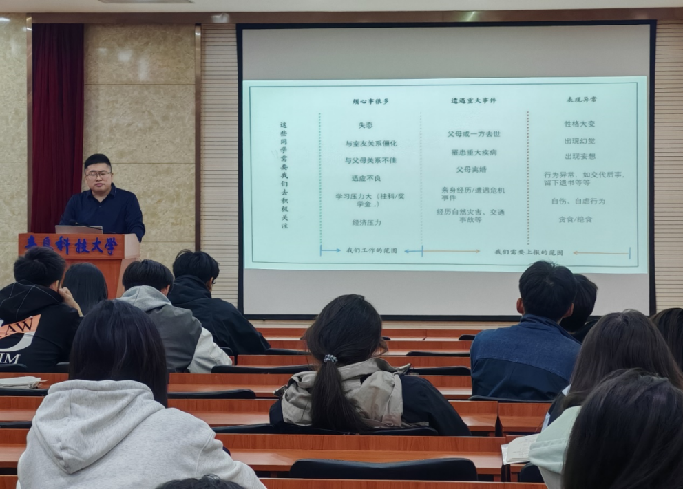 培训还着重讲了一下学生“压力管理”。他指出,适当的压力是推动人们进步的动力,但过度的压力则会对身体和心理造成负面影响。他介绍了多种压力管理技巧,包括时间管理、情绪调节、积极思考等实用方法。郑开齐特别提醒大家,在面对压力时,要学会寻求帮助、合理表达情绪,并培养积极的心态。面对学业、工作或生活中的压力,大家不应一味压抑,而应主动寻找合适的方式来释放和调节压力,从而保持心理健康和整体的生活平衡。