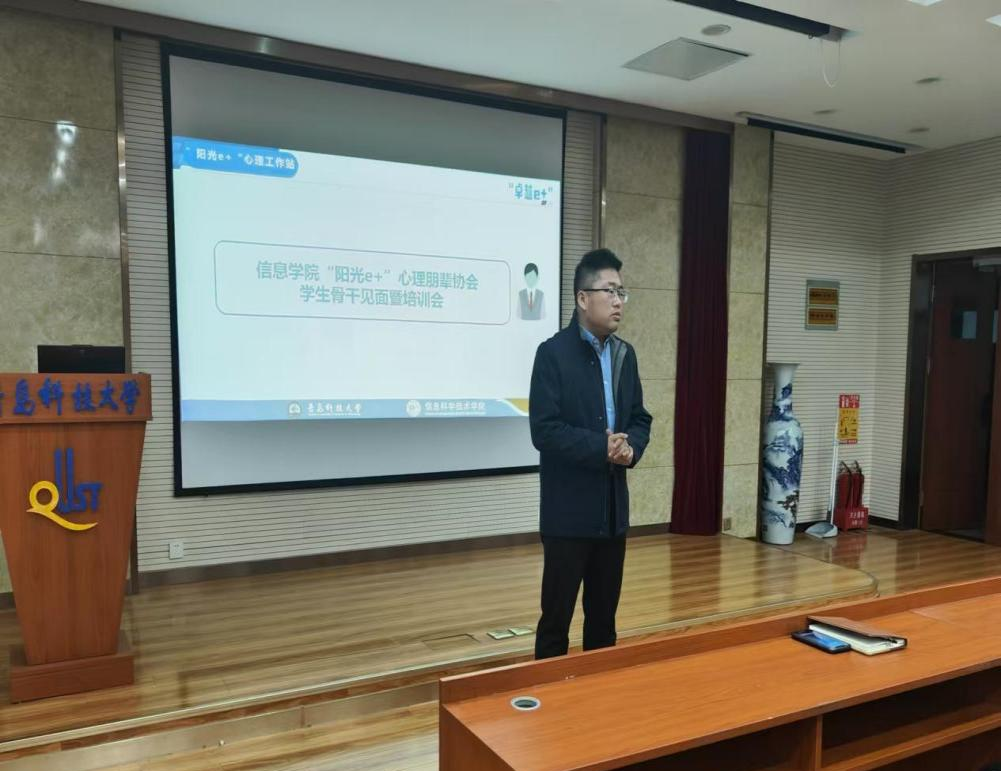 为提升同学们的心理健康水平,更好地发挥心理工作站学生骨干在学院中的重要作用为同学营造一个美丽、和谐、充满关爱的校园环境信息学院于10月29日下午组织开展“阳光e+心理工作站朋辈坊骨干见面会。会议由学院心理工作站指导老师郑开齐主持学院心理工作站朋辈坊全体骨干参加。
