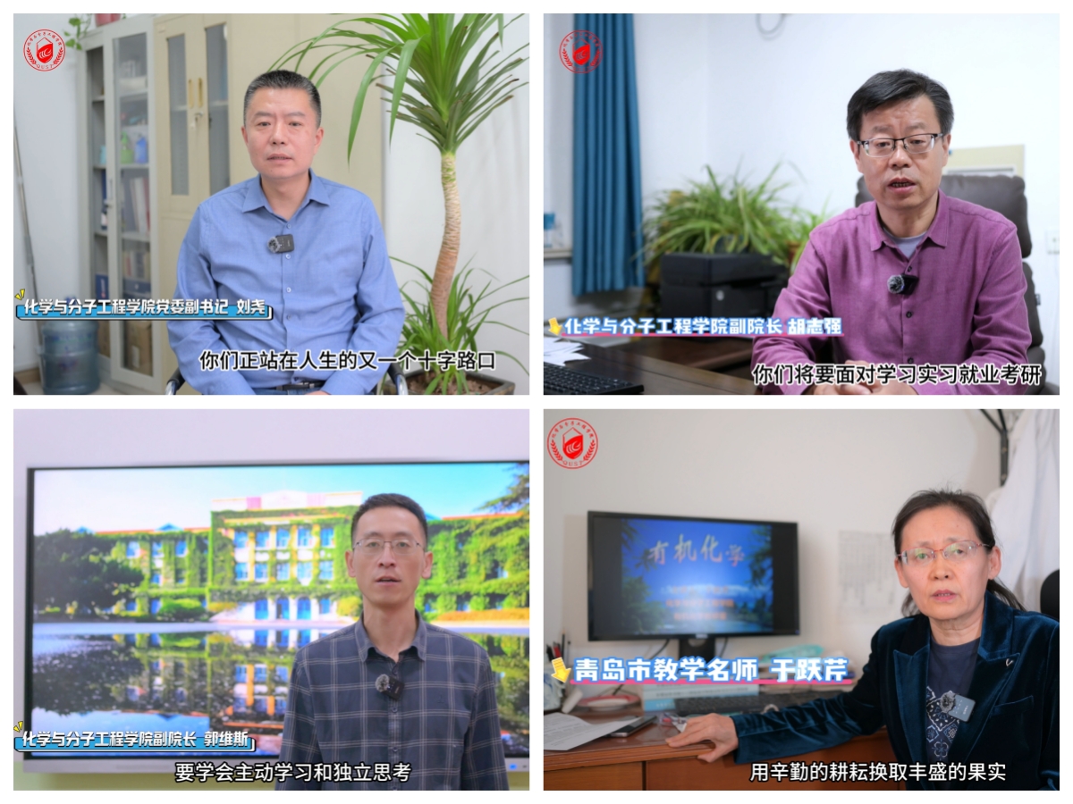 化学院党委副书记刘尧、副院长胡志强、副院长郭维斯、青岛市教学名师于跃芹,通过视频表达了对不同年级学生的祝福、期盼和建议,不仅让学生们感受到了来自老师的关怀与温暖,也进一步拉近了师生间的距离。