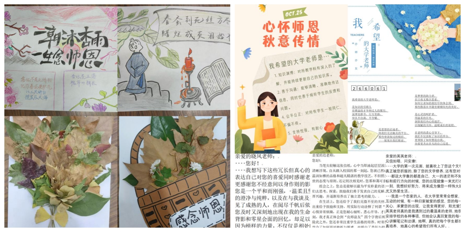 诗画相传、秋叶寄情。学生们通过线上线下投稿的形式,创作与老师相关的创意作品。绘画、秋叶手工艺品、明信片、信件等,无不展现了学生们对老师的深厚情感。