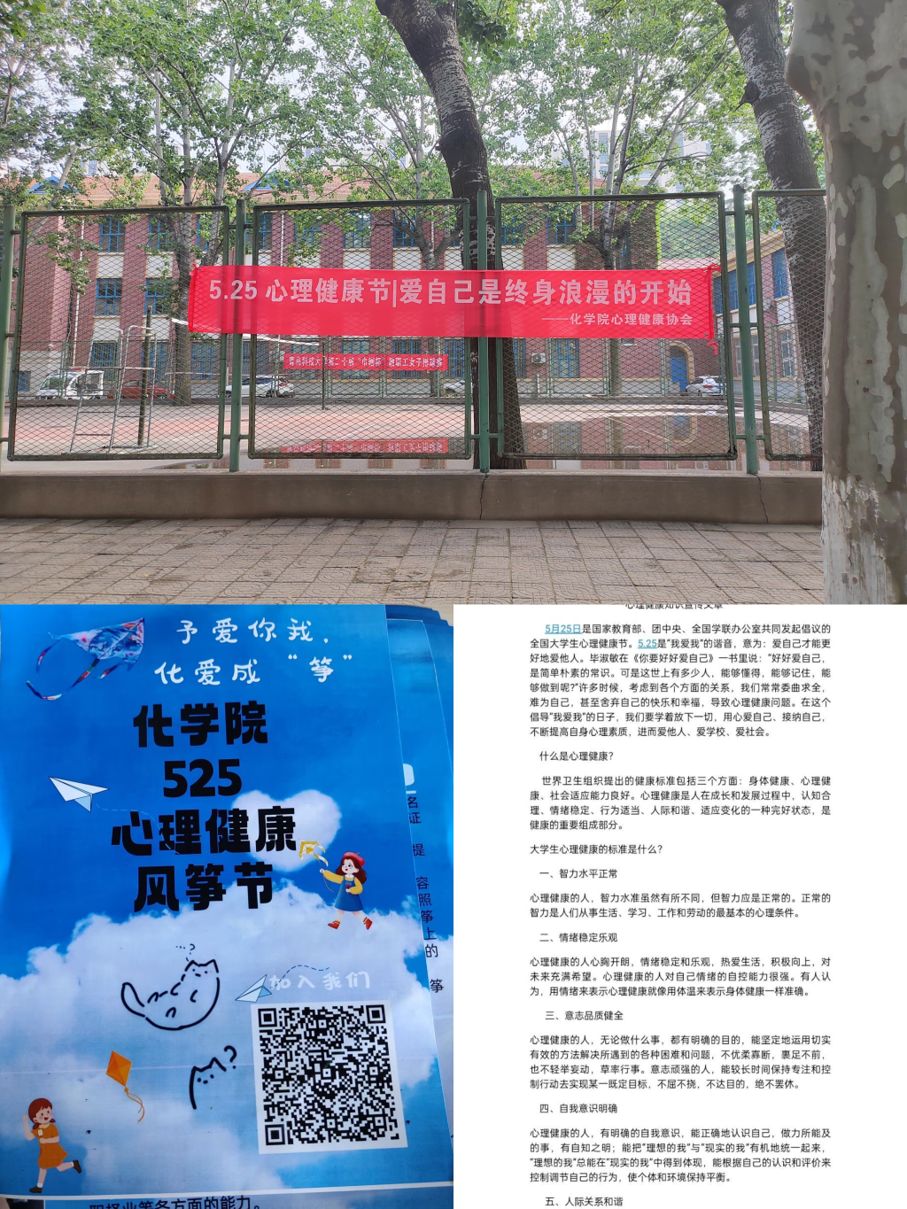 针对“5·25我爱我”主题,开展线上、线下心理健康知识宣传和活动氛围营造。分别开展线上公众号推广、线下海报宣传、条幅宣传,扩大宣传营造氛围,以“放飞心灵,放飞梦想”“拥抱阳光,拥抱希望,珍爱生命,善待自我”“5·25心理健康节——爱自己是终身烂漫的开始”推进“阳光心理”、“大心理”理念推广,让同学们对心理知识有更多的了解的同时增加了对心理健康节活动的期待。