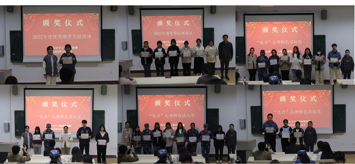 三部心理健康宣传视频从心理健康知识普及、心理活动的效应介绍等方面进一步宣传心理健康知识。各位老师为2022年度院级优秀心理委员、朋辈互助团体和“化合”心理优秀创意活动的获奖人员进行了表彰和颁奖。获奖的各位心理委员在2022年度都积极扎实地进行心理健康宣传教育工作并在班级层面心理健康教育活动开展方面做出了突出贡献。本次颁奖进一步提高了心理委员的主观能动性和进取心,进一步强化“化合引领,心理助航”,全力做好学院心理健康教育工作。