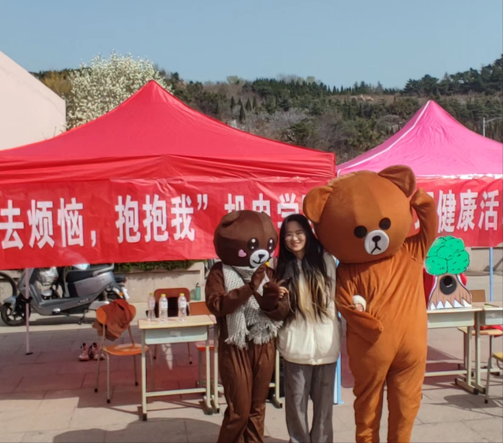第三个活动——拥抱大熊,去除烦恼。每个人在烦恼无助的时候,往往需要一个拥抱。大熊正是健康、积极、阳光的代表。大熊给予的怀抱可以温暖每位同学。