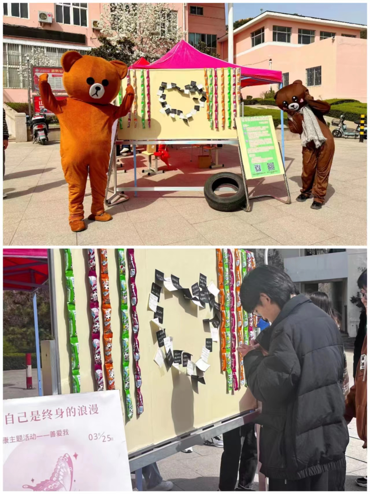 为进一步加强大学生心理健康教育,倡导大学生善待自我、共创美丽校园。3月25日,机电工程学院心理协会联合心音心理健康协会面向全校师生在南苑餐厅门口开展“3·25善爱我主题活动”。