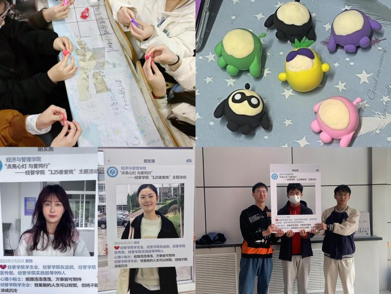 “善意温暖,守望相助”黏土创作活动中,同学们充分结合本次活动的主题要素,发挥自主创新意识、应用创新实践能力,将无法触及的内心世界转化成有形的艺术作品,在活动过程期间,同学们相互指导相互治愈,善意与温暖在你我他之间传递。“循梦而行,向阳而生”相框拍照活动中,师生一同在经管楼大厅和印有“点亮心灯,与爱同行”活动主题的相框合照,本次活动提供了教师与同学的面对面交流的平台,拉近师生间的距离,有效减轻学生的心理压力,有利于促进青年学生心理健康成长。