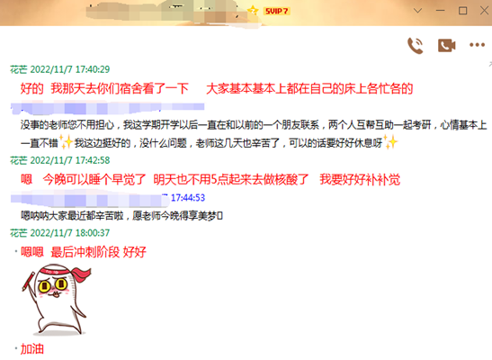 “陪伴是最好的教育,倾听是最好的沟通”。辅导员老师始终在一线坚守,涵养“一枝一叶总关情”的深厚情怀,走访每一个学生宿舍,走近学生,并对重点关注学生进行一对一沟通,缓解同学们内心的压力与恐惧。在疫情这一大环境下,每个学生的内心都经受着不同程度的考验,封闭管理期间活动地点的单一使得学生的心理状况更加敏感脆弱。辅导员老师与同学们始终心连心,想学生所想,忧学生所忧,畅通问题反馈机制,及时解决问题化解危机,为学生的顺利度过疫情封控期保驾护航。