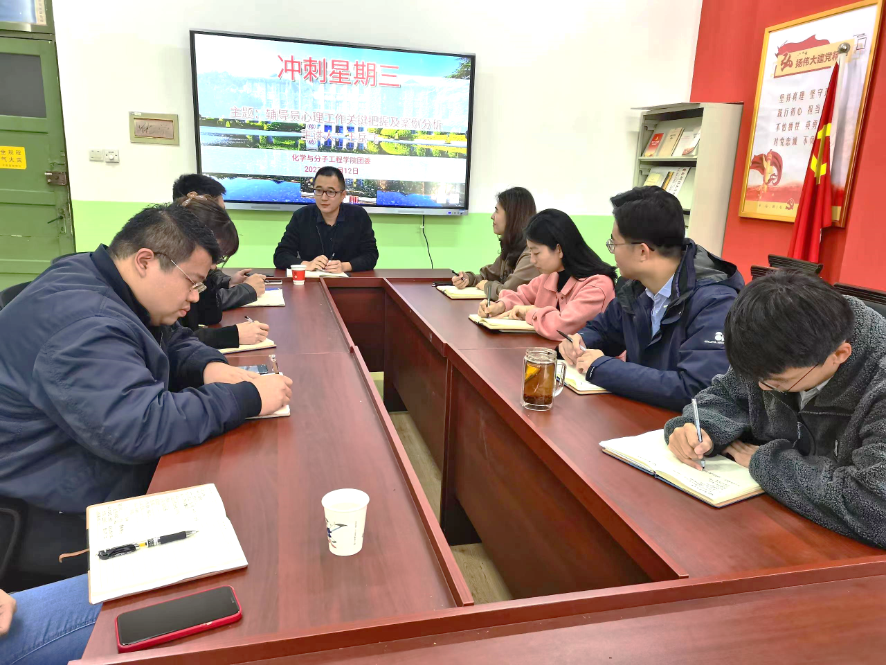 为强化学院辅导员队伍体系建设,落实学校《2022年秋季学期辅导员素质能力提升方案》, 10月12日,化学院在党建活动室开展“冲刺星期三”活动。本次“冲刺星期三”以心理健康教育为主题,由心理中心王岳飞老师担任主讲嘉宾。学院全体辅导员老师参加培训。