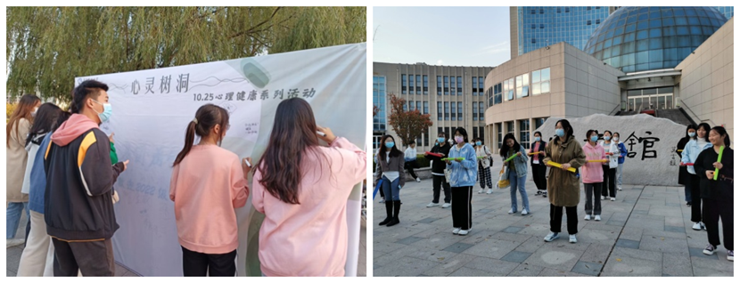 活动包括心理咨询辅导、心灵树洞、团体辅导等环节。心理咨询师现场提供心理咨询服务,解同学在学业、生活、成长等方面之困惑;参与同学在心灵树洞宣泄墙上畅所欲言,写出自己内心所想,让老师更加了解学生;随后进行现场团体辅导活动,在游戏中放松自己,拉近彼此之间的距离。
