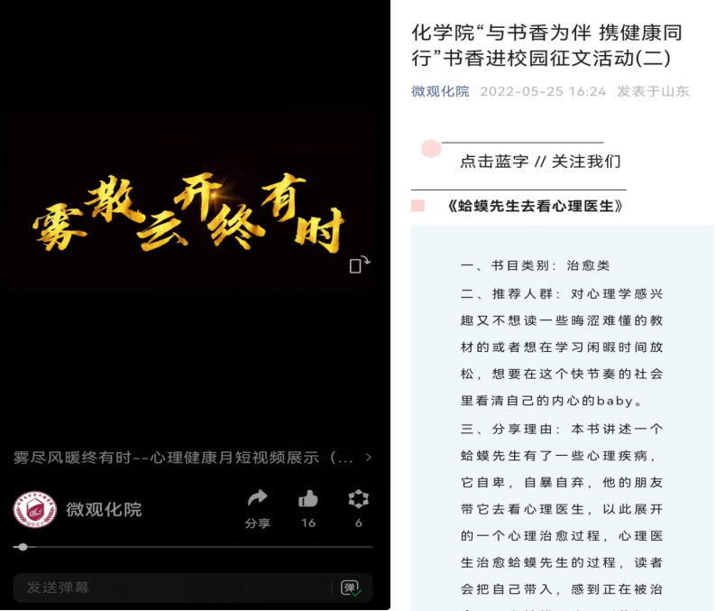 为进一步提高同学们的心理素质,促进大学生的心理健康和谐,宣传普及心理健康知识,化学院展开了一系列“‘化'样年华,予爱同行”“5.25我爱我”系列活动。