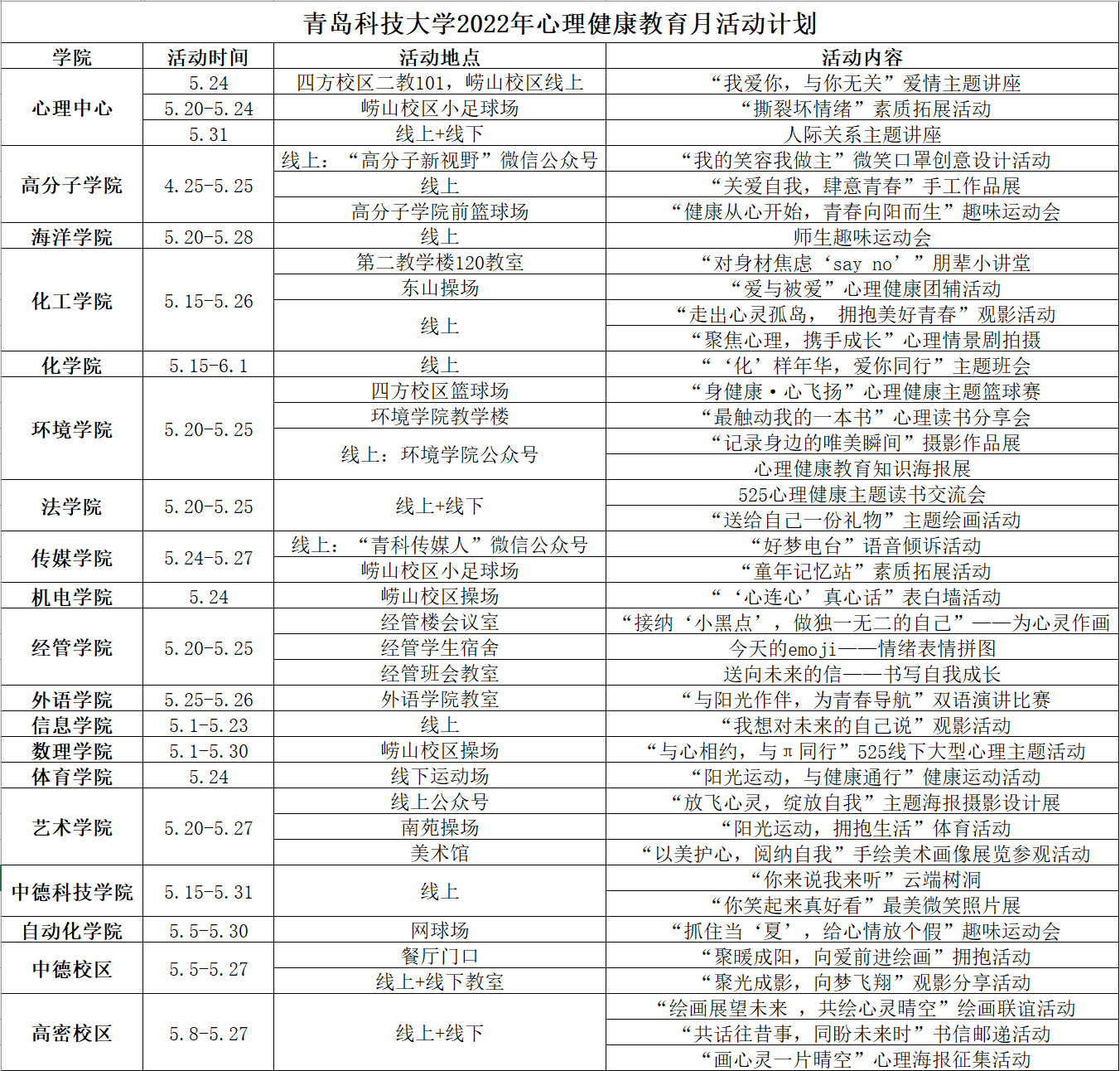 据悉,心理中心前期以“‘疫’路同心  温暖守护  健康成长”为主题组织召开心理健康月活动筹备会,与心理工作站站长一起“头脑风暴”,策划形式多样的心理健康活动30余场次。学校将通过线上线下各种途径,以学生需求为出发点,结合疫情防控需要,设计举办心理短视频大赛、教师微课大赛、班团活动等,活跃校园文化氛围,提升师生心理健康素养,全面促进学生身心和谐发展。