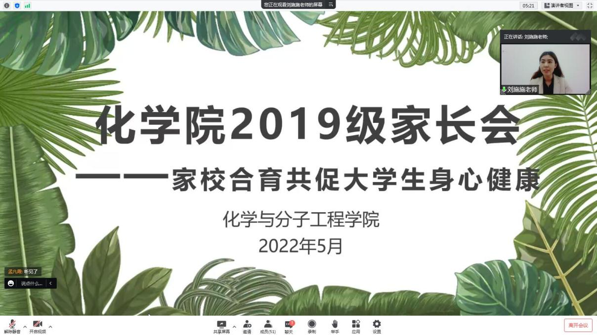 为落实学校心理健康工作要求,同时为加强学院家校合育,促进学生全面发展,引导学生日更好地成长成材。5月16日到5月18日,化学院本科生各年级依托线上平台召开“化合同心,家校合育”心理健康主题线上家长会。