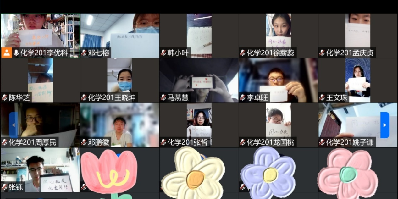 为向同学们提供更多缓解焦虑的科学方法,化学201班开展了“同心抗疫,化爱同行”线上朋辈课堂的活动。会议上,从理论知识到生活经验,为同学们提供了许多放松自我的方法,也再次强调了疫情期间的相关要求,督促大家严格纪律,同时鼓励大家坚定信心,积极乐观地面对困难。会后同学们还一起打开视频,手拿写有“同心抗疫,化爱同行”的卡片,一起为“爱”加油。
