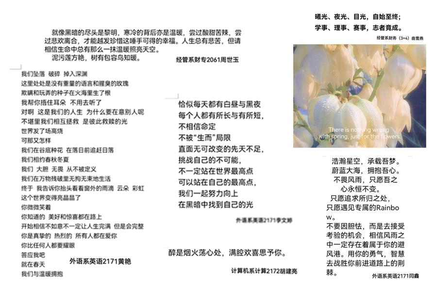 在“拥抱爱”活动中,同学们可以写出自己喜欢的句子或者标语,它可以是一条人生感悟、成长经验或是对陌生人的祝福和鼓励,然后以线上投稿的方式参加,在带给自己温暖的同时,也帮助了处于迷茫中的同学,让同学们感受到来自“陌生人”的关心和爱护。本次活动旨在通过相互分享好词好句让大家在疫情下的校园也能够提高保护自己、爱护自己的意识。保障学生的身心健康。