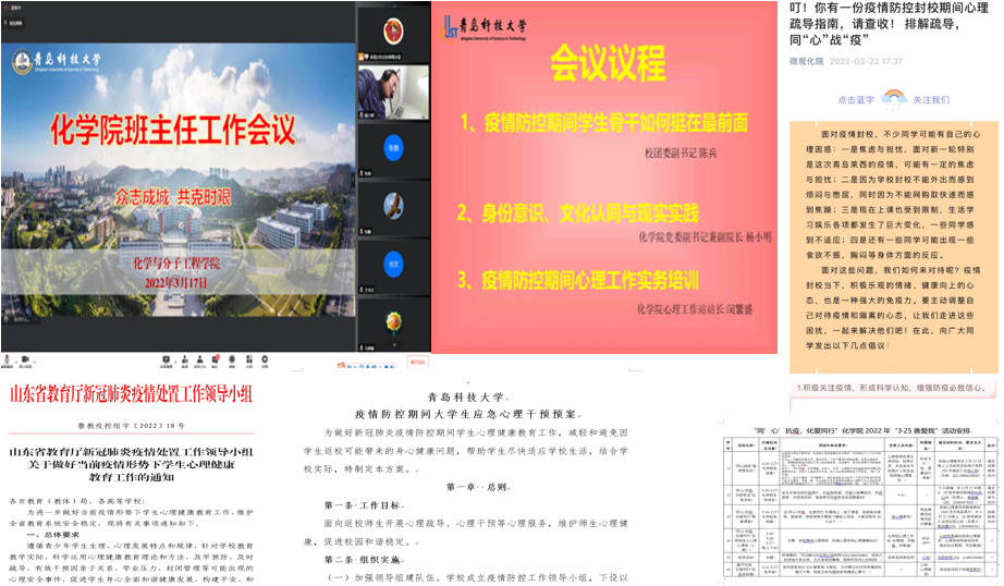 组织学习《山东省教育厅新冠肺炎疫情处置工作领导小组关于做好当前疫情形势下学生心理健康教育工作的通知》和《伟德国际1949官网疫情防控期间大学生应急心理干说预预案》,组织学院班主任、团学骨干、心理委员等开展线上心理疏导业务培训,在学院“微观化院”公众号发布《同“心”战“疫”,排解疏导,——做好疫情防控封校期间的心理疏导》推文,制定学院“3·25善爱我”活动规划。