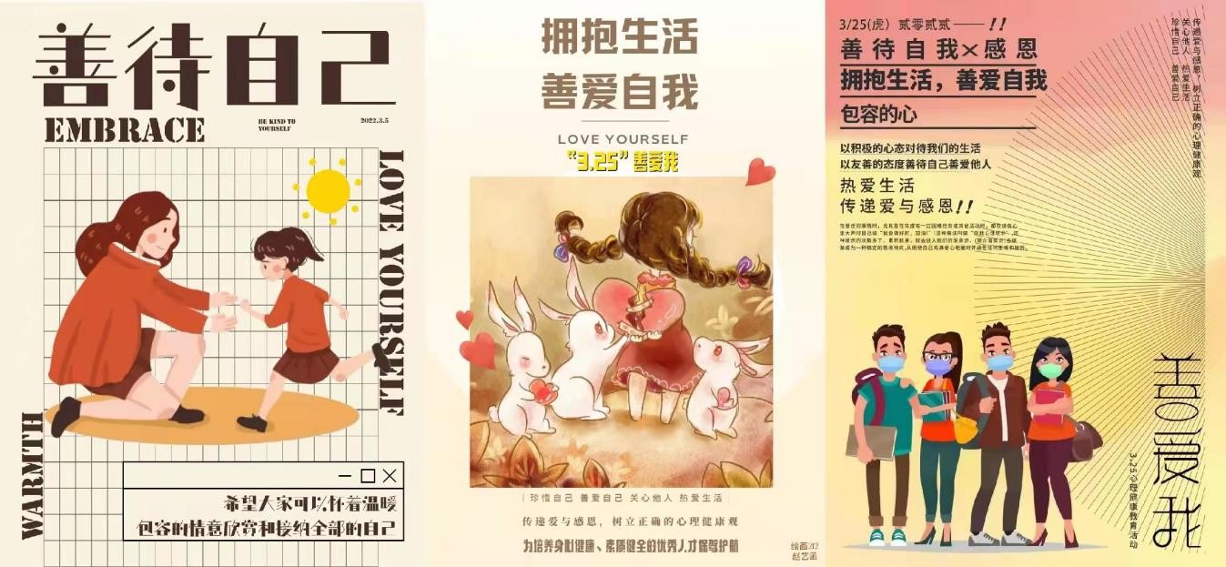 为进一步增强艺术学院在校生心理健康意识,培养学生理性平和、积极向上的健康心态,特别是在疫情防控背景下提升大学生的心理健康素质,学院近期组织展开以“拥抱生活,善爱自我”为主题的“3·25善爱我”心理健康节系列活动。
