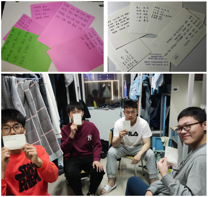 为活跃气氛,增进感情,室友们用笔写出彼此的优点,在朗读中互相亲近,拉近彼此的距离,了解他人不曾体现的另一面。一张张彩色的卡片,联系了一颗颗热情的心,给紧张气氛下的校园增添了温暖。