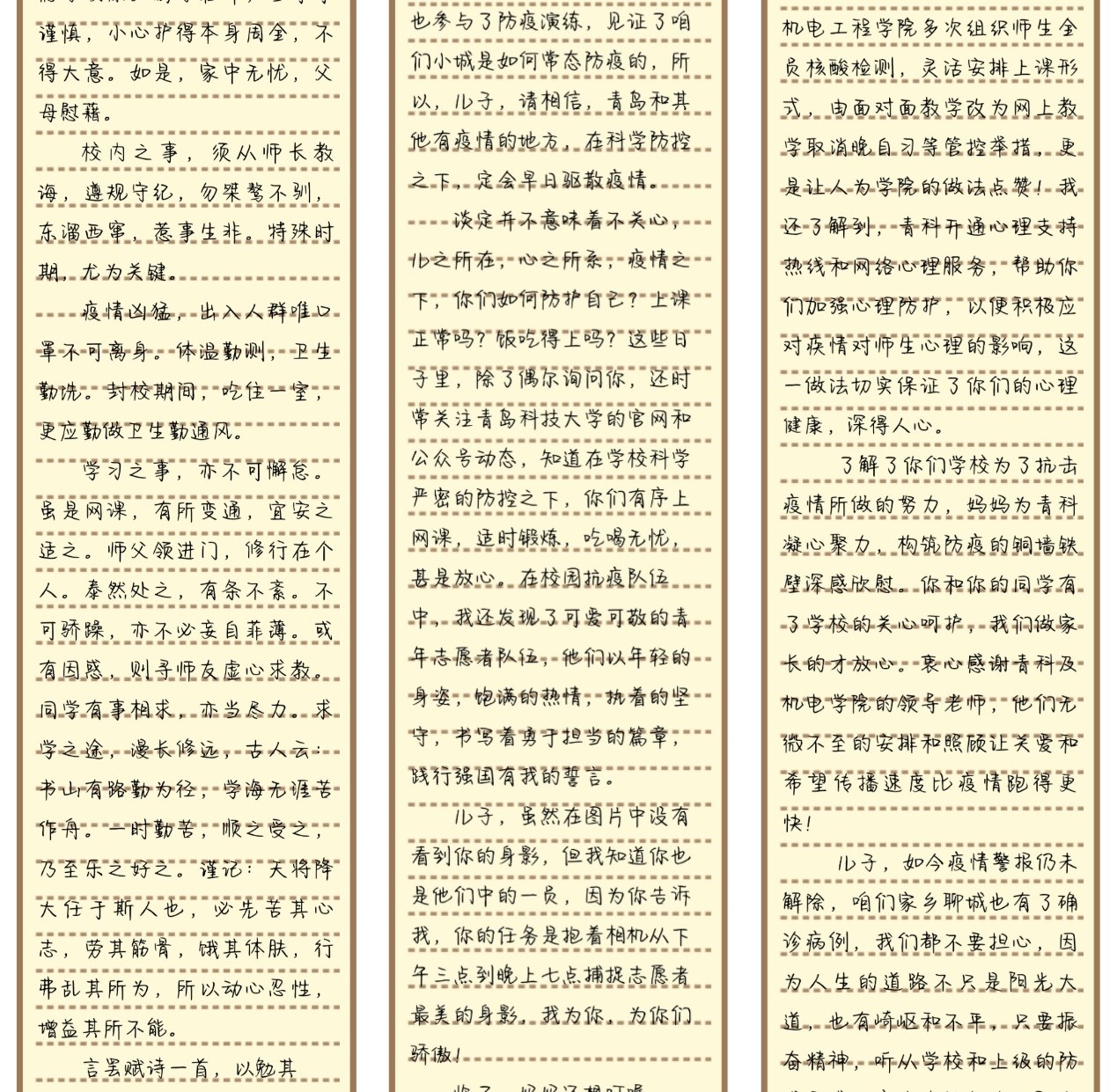 前段时间,青岛疫情形势严峻,父母与孩子远隔山河,家书成了父母与孩子之间唯一的沟通桥梁。父母的殷殷嘱托、谆谆教诲及附在家书上的思念与担忧牵动着孩子们的心,也给疫情中的同学们打了一针强心剂。