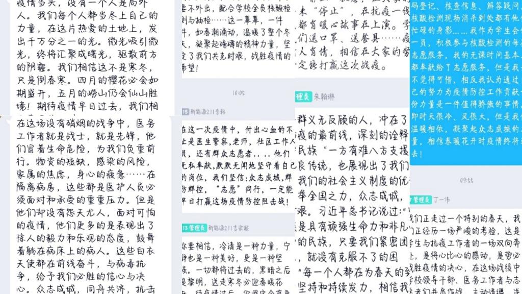 面向年级学生征集抗疫日记,分享抗击疫情期间学习、生活心得、收获与感悟,以学生喜闻乐见的方式,开展心理健康活动,搭建沟通桥梁,增进同学相互理解交流,隔离病毒不隔离关爱,传递积极向上正能量。