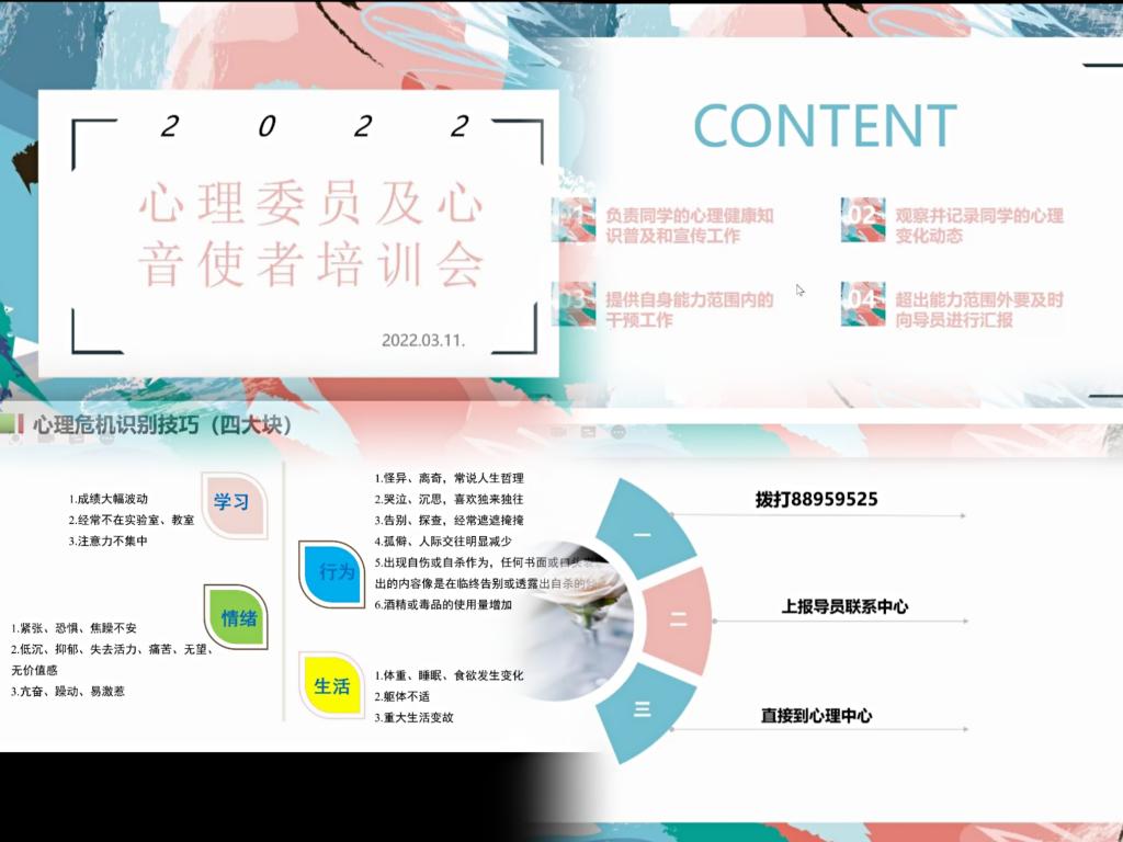 通过本次培训会宿舍长及心音使者们对于自己在关注同学们心理健康状况方面的职责更为明确在今后的学习和生活中相信宿舍长及心音使者们能够带领同学们更好的认识自我悦纳自我让同学们朝着更加健康积极的方向发展