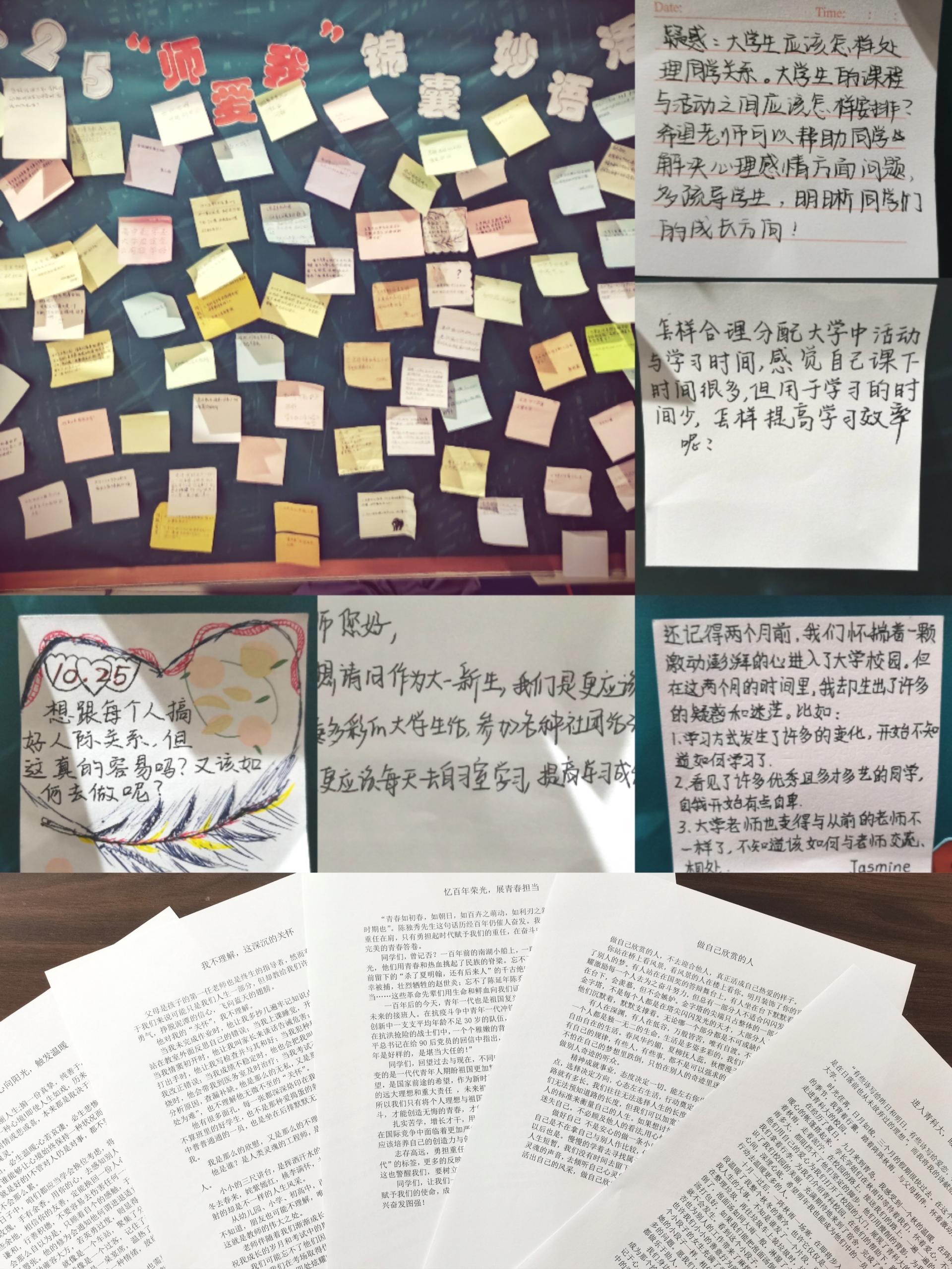 为学莫重于尊师,经管学子在“锦囊妙语墙”“心向阳光触发温暖”征文等活动中,以笔为介、以墨传情,把自己想要对老师说祝福和感谢或者是内心的困惑通过文字向老师传达。活动引导大学生深入思考人生追求,明确自己奋斗方向,做出正确的价值判断与价值选择,提高心理健康素质,同时帮助老师与学生加深心灵的交流,构建师生沟通的桥梁,营造师生之间彼此尊重、理解、关爱的关系。