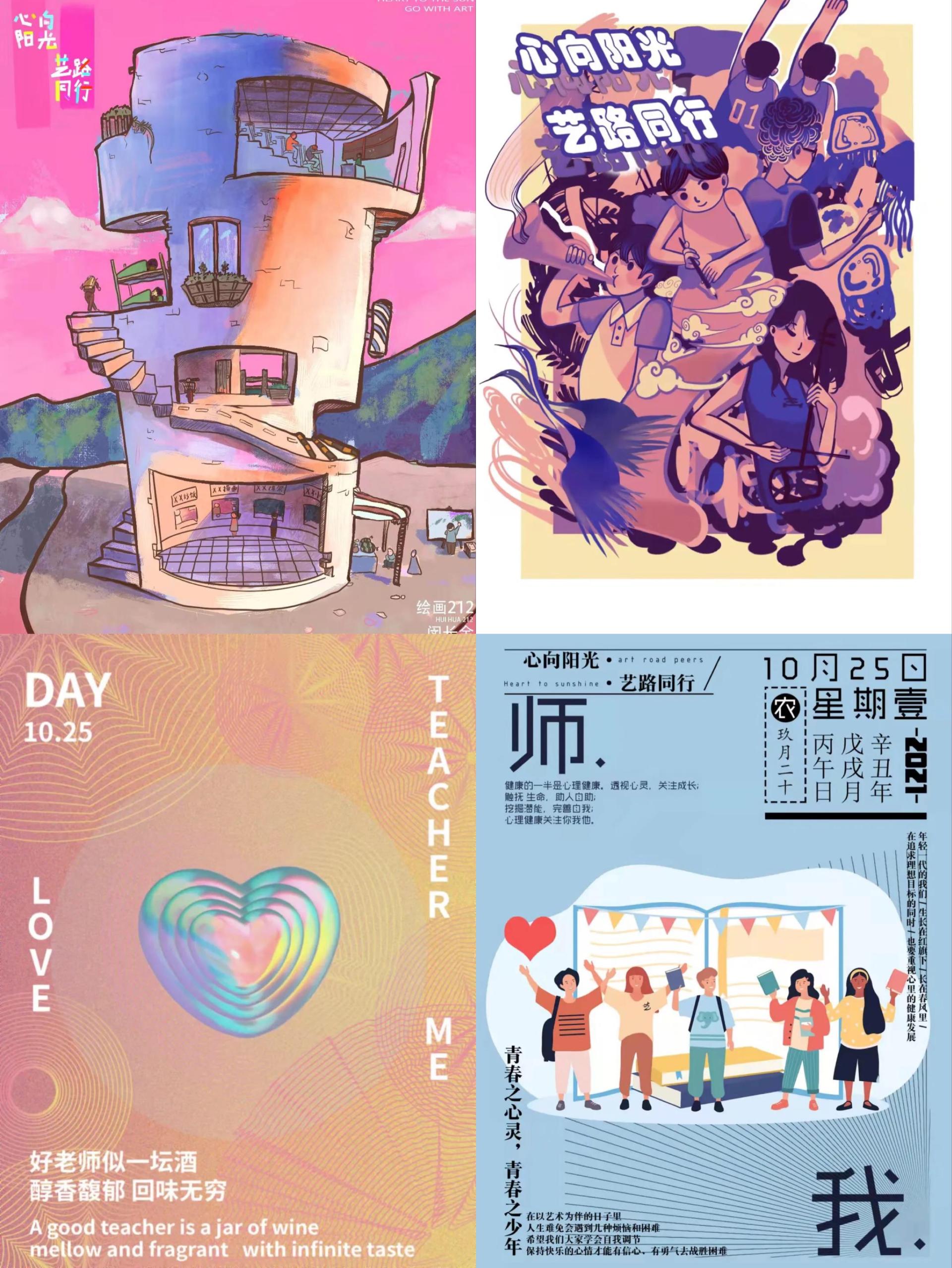 发挥艺院学子专业优势,通过微信公众号征集到近60余件“师爱我”心理健康教育原创作品作品以“心向阳光·艺路同行”为主题,从文案、逻辑思维、个人创意、视觉效果等多方面甄选出多幅优秀作品让学生在创作中培养静心平和的心理情绪,创作和谐稳定的文化氛围。