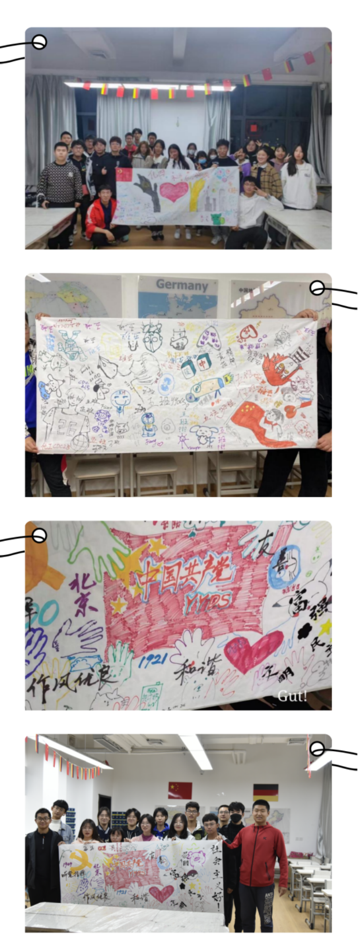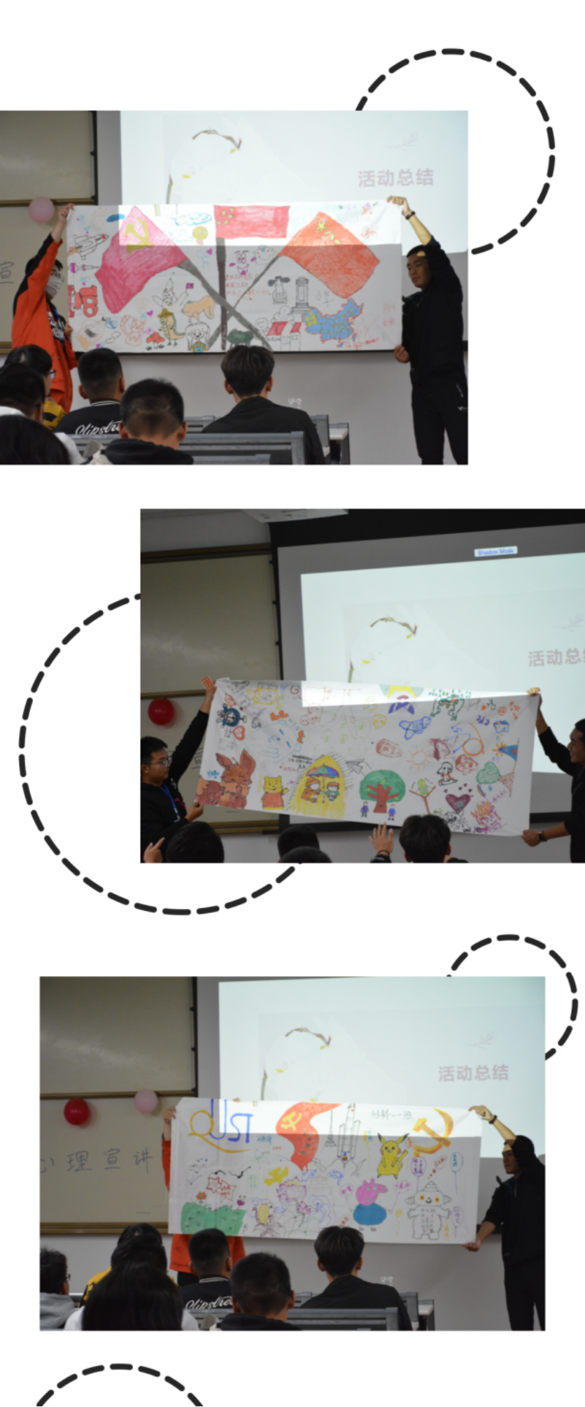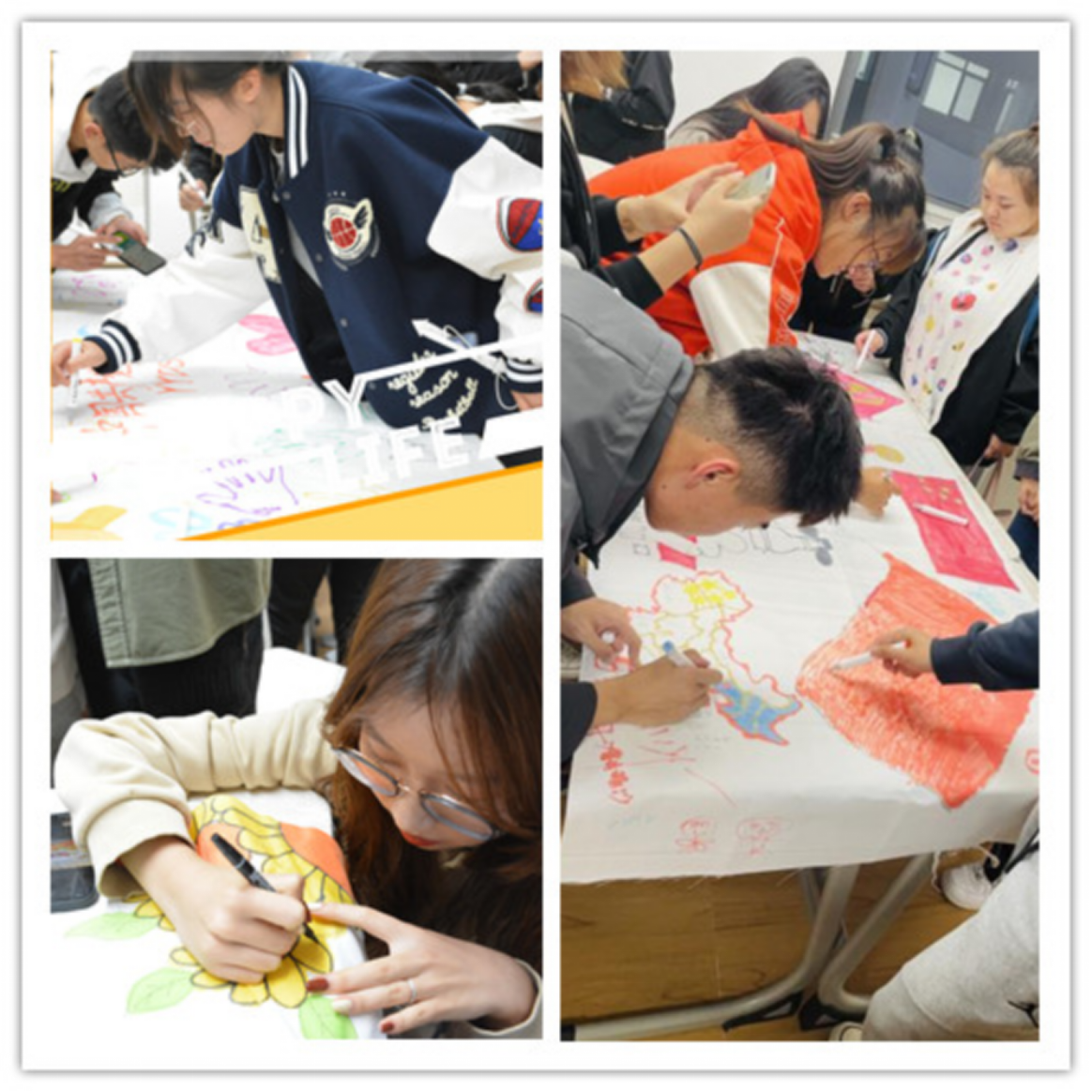 绘画过程中,那些看起来笨拙、生涩的笔触表达出许多情感,一面面党旗、国旗,一个个卡通图案跃然布上,老师带同学们展示出了心中的爱国情感与对大学生活的热爱。班级同学之间也借此机会有了更深入的了解,促进他们的人际沟通,从而进一步地认识自我、探索自我,更好地调节心态、笑对大学生活。