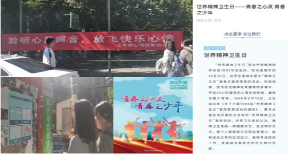 30个“世界精神卫生日”来临之际,化学与分子工程学院围绕“青春之心灵,青春之少年”主题组织开展世界精神卫生日系列主题活动。