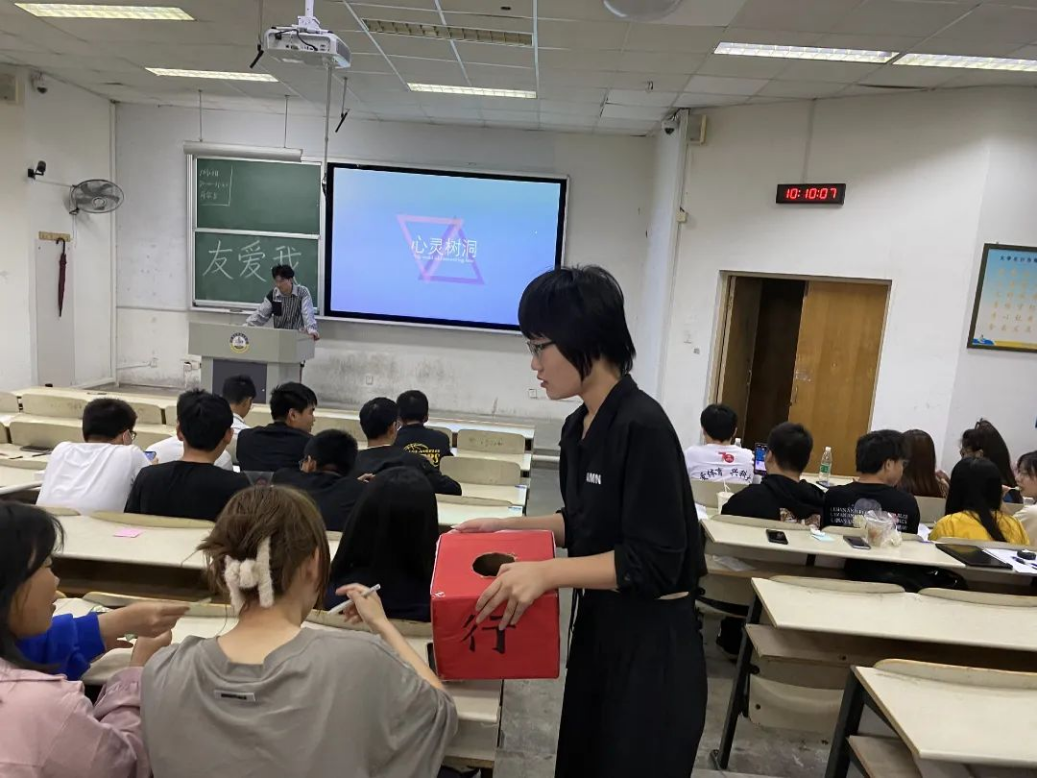 其中,心灵树洞活动的同学参与度很高。同学们将自己心中所有的困惑或者表白的想法,投放进“树洞盒子”中。然后由学长学姐随机抽取进行解答。活动中,同学们以匿名的形式提出自己的疑惑,给同学们提供了一个倾诉的平台;使新同学心理健康意识得到提高,优化了心理品质,提升了心理调节和社会适应能力。