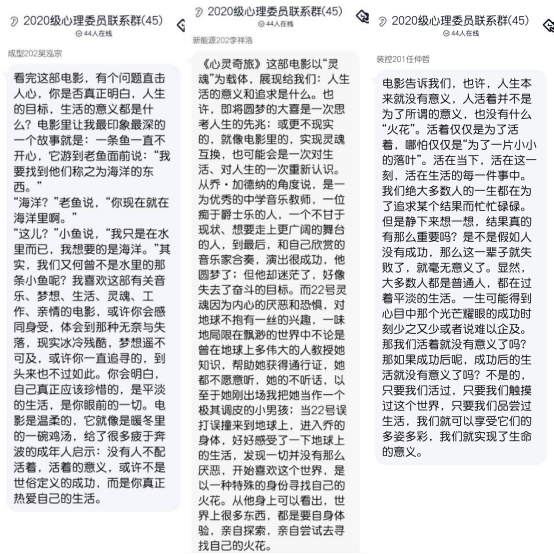 本次观看的电影是《心灵奇旅》,电影以艺术的方式浓缩了人生的点点滴滴,积极引导学生思考人生意义,感受生命的美好与幸福。整个观影过程安静有序。观影结束后,同学们纷纷提交了个人的观影心得与感悟。