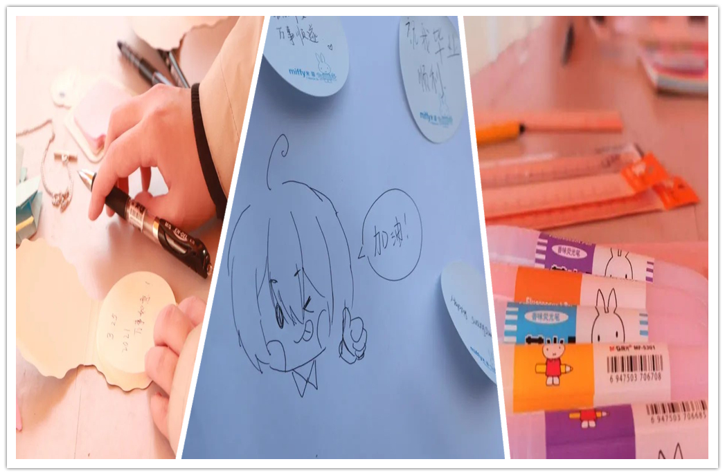 同学们写下的愿望和祝福丰富多彩,如考研上岸、过四六级、身体健康等,这都是大家对未来的期望和对生活的热爱,同学们书写完祝福后或是认真观看展板图上的减压小建议、又或是写上真诚的祝福折成千纸鹤的模样,送给来往的路人。这看似细小的举动,却能传递给他人莫大的温暖和鼓励。