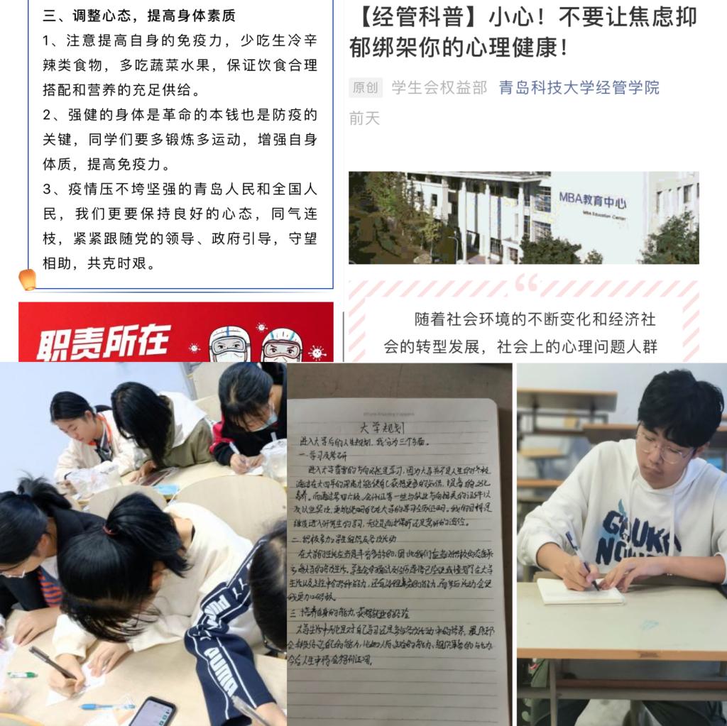经管学院开展以“开启‘心’路程,享受‘心’生活”为主题的形式多样的主题团日活动,召开“关爱自我、温暖心灵”主题班会,以心理知识教育、防疫事例宣讲和日常防疫要素普及为重点,引导学生积极乐观正视身心问题,奋发蓬勃迎接大学生活;组织“我还是从前那个少年”和“最美笑脸”团日活动,通过学生分享自身进步点滴,引导学生重温入学初心,检视自身发展成果,以乐观稳定的心态、斗志昂扬的精神、创新自信的态度完善自我人格,迎接未来挑战;开展“预见未来的你”主题活动,鼓励学生制定大学生职业生涯规划和书写“致未来的一封信”,引导学生树立积极的生活态度,激发、调整、强化、升华学生的身心潜能,刻画开放活力、果敢创新、奋发有为的大学新篇章。同时学院利用官方微信公众号推送疫情期间心理健康知识科普文章,充分发挥网络思想政治教育的引领作用。