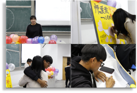 紧接着,“心灵时钟”游戏活跃了现场气氛,增加了同学们之间的交流沟通,培养了同学之间的默契度。最后,殷老师在心愿板上写下了对学生的寄语,同学们在心愿板上粘上了自己对老师想说的话以及对未来的期待,并和老师亲切地拥抱。