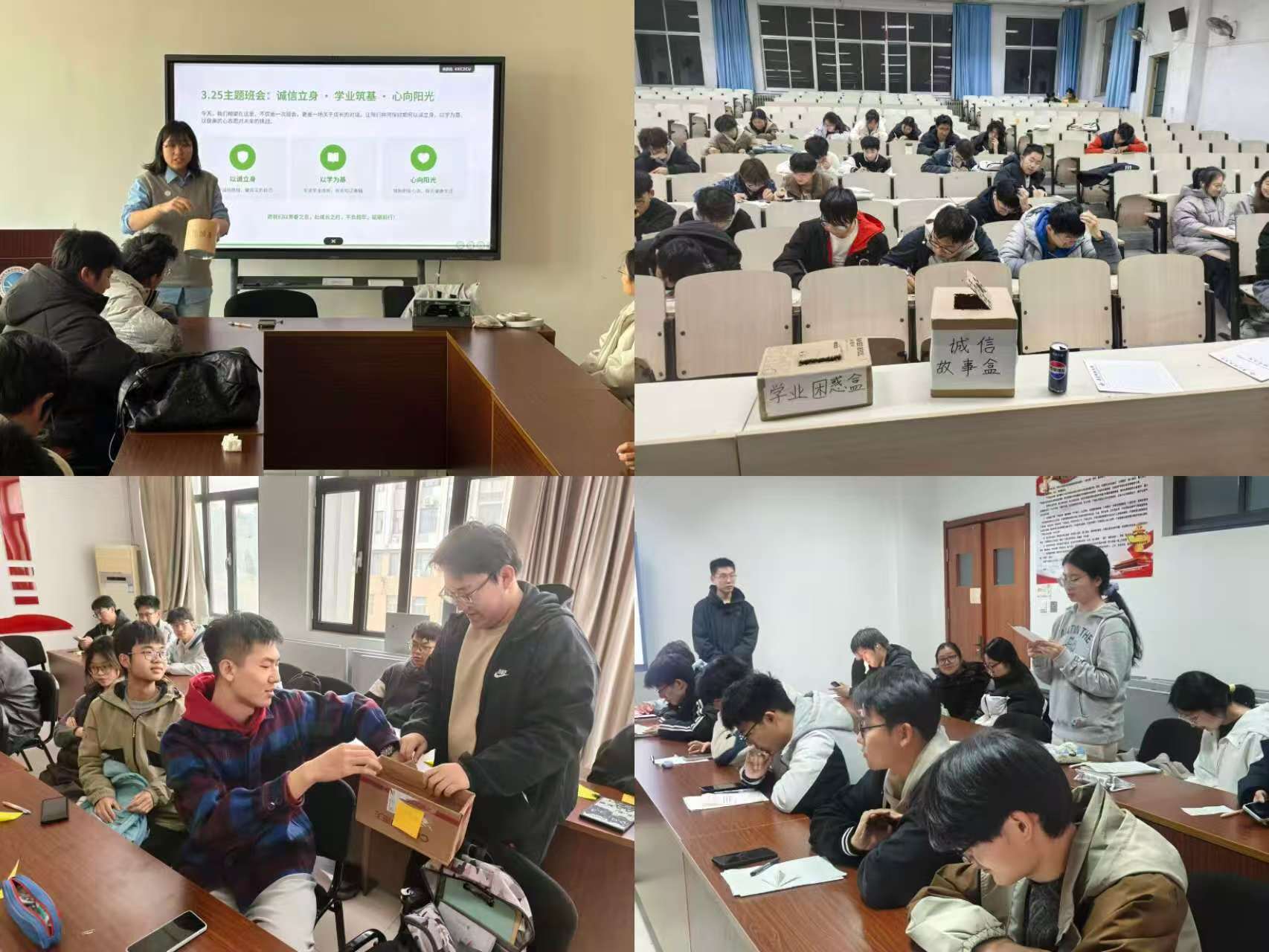 本次活动前期筹备周密规范,各班级紧扣活动主题,精心制作诚信故事盲盒、学业困惑盲盒,配套准备分类色彩卡片等物料,为活动有序开展筑牢基础。各班心理委员紧扣“学风诚信·心理护航”的3·25活动核心,系统解读学术诚信的核心内涵与优良学风建设的实践要求,明确匿名、真诚、尊重、保密、正向的五大活动原则,为同学们营造安全、包容的交流氛围,保障大家敞开心扉、放心表达。活动现场,同学们以匿名形式,将自身学业发展中的困惑迷茫、诚信治学的成长经历与感悟思考书写于卡片之上,分类投入对应盲盒。