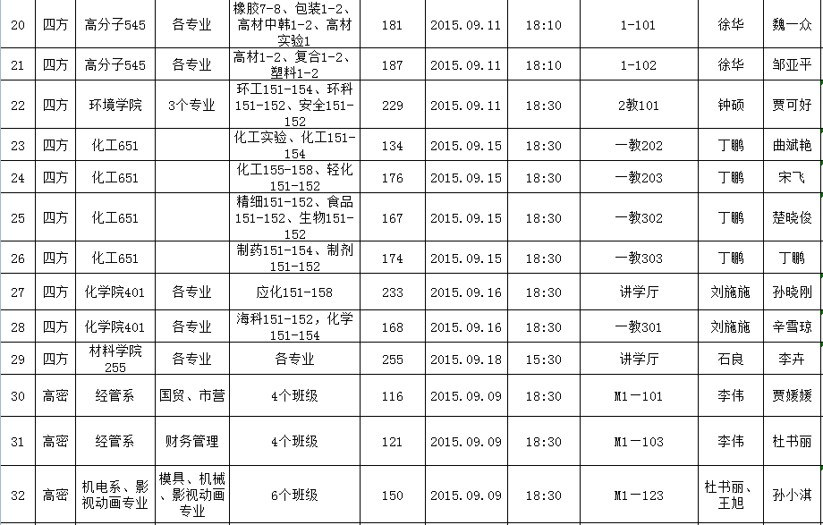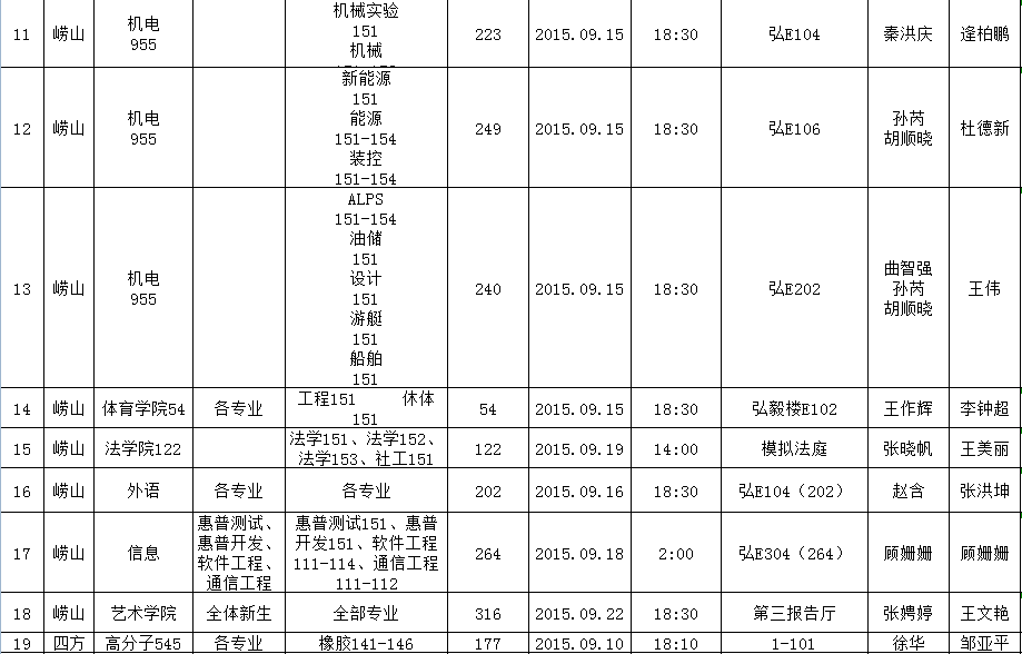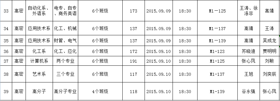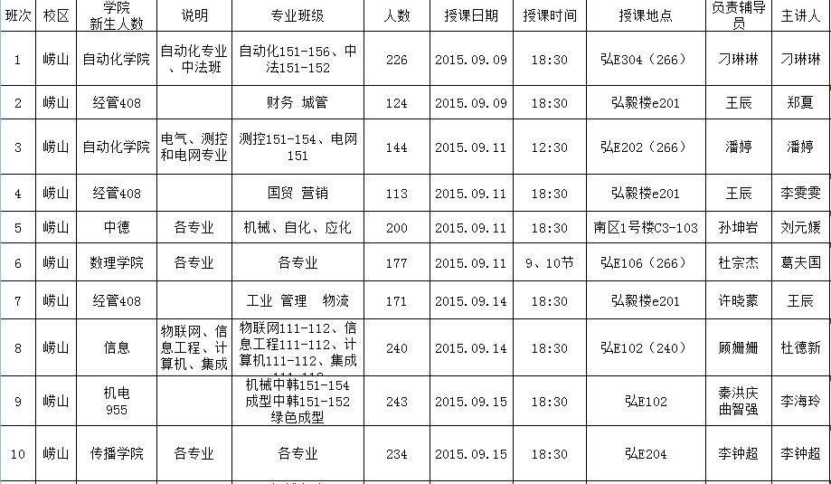 2015-2016学年第一学期新生心理适应性教育课程安排