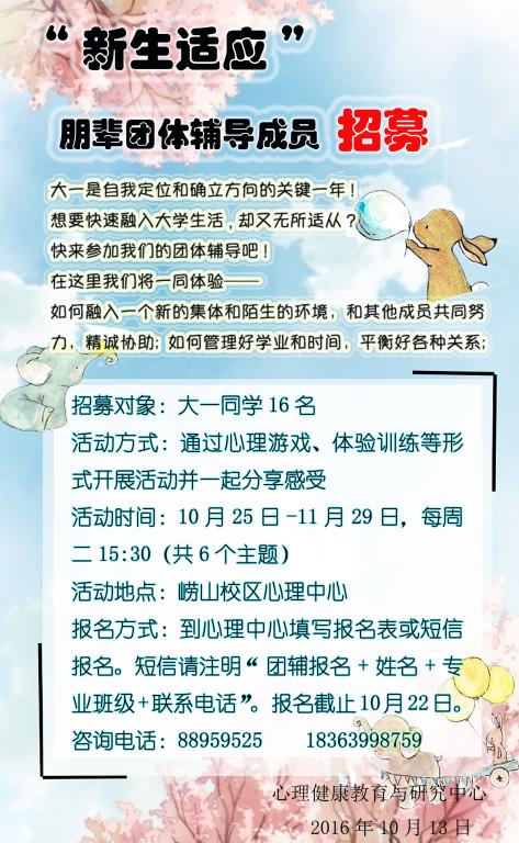 关于“新生适应”朋辈团体辅导成员招募(崂山)的通知
