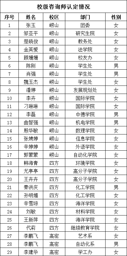 为贯彻落实《高等学校学生心理健康教育指导纲要》中关于加强队伍建设的要求,提高心理咨询服务育人水平,根据《伟德国际1949官网心理咨询师队伍管理办法》、《关于开展校级咨询师认定工作的通知》文件精神,参考个人往年咨询时数、学生满意度等指标,拟选聘张玉等29位老师为伟德国际1949官网校级咨询师,聘期两年,现予以公示。