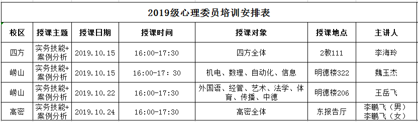 1.心理中心负责对2019级心理委员进行实务技能的培训,详见表1;