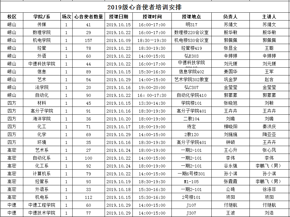 2.心理中心提供培训参考讲义(见群共享),学院工作站参照课件于10月31日之前完成对2019级心音使者的基础知识培训,详细安排见表2。