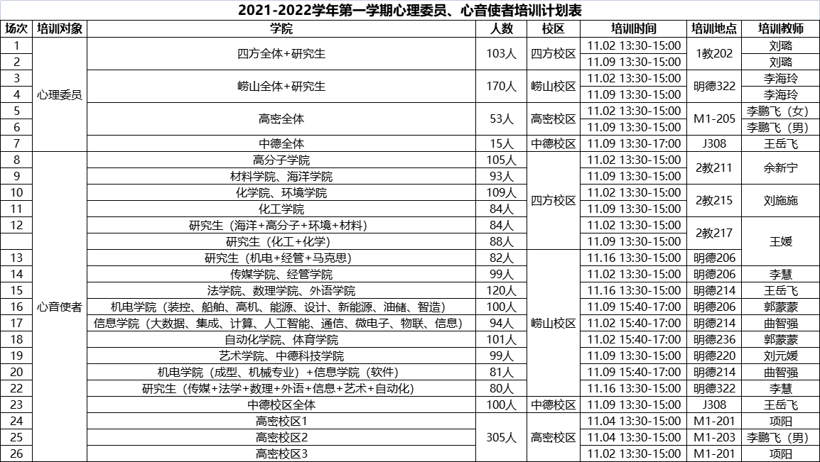 心理中心安排专业教师对2021级心理委员、心音使者进行实务技能的培训,具体时间、地点、参与人员见下图。