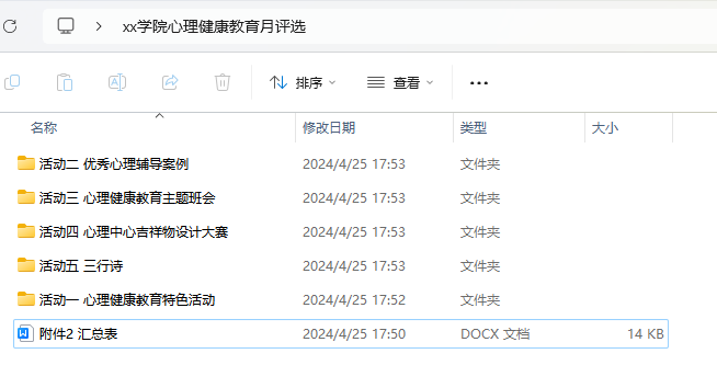 请各学院、校区收集上述活动提报材料,填写附件2汇总表,并将所有材料按照活动名称命名和归类(参考下图)后统一汇总到一个文件夹中,命名为“xx学院心理健康教育月评选”,于5月20日前发送至邮箱qdqust88959525@126.com。