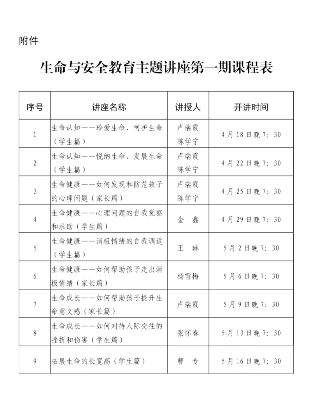 为进一步帮助广大学生预防与减轻心理困顿,启迪学生珍惜生命、尊重生命,进一步提升学生安全素养和基本技能,按照省教育厅的要求,现在全校范围内组织开展生命与安全教育系列主题讲座活动,现将有关事项通知如下: