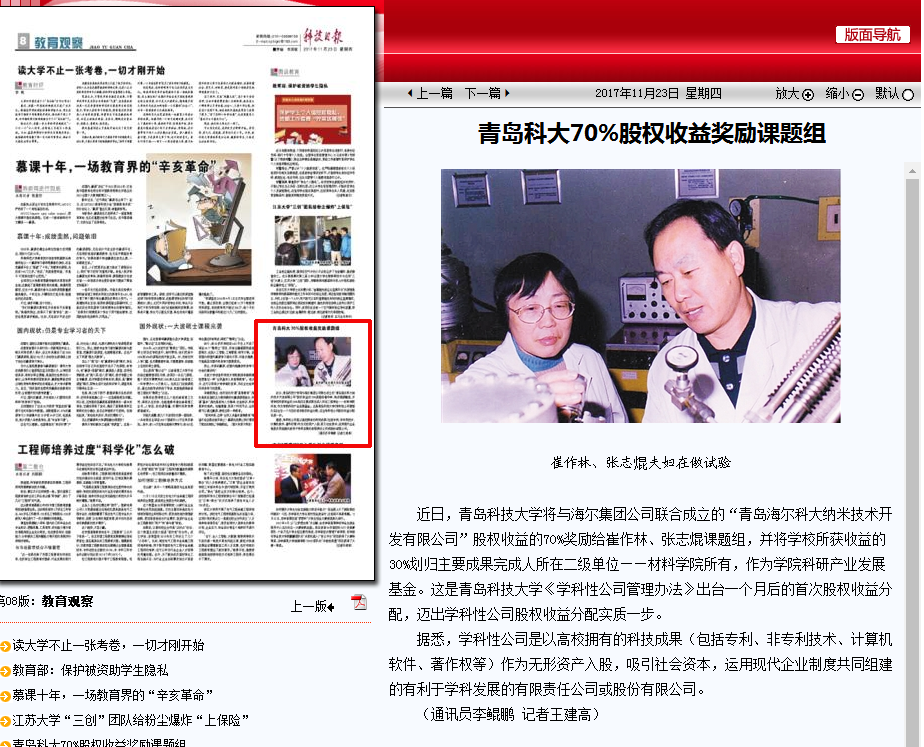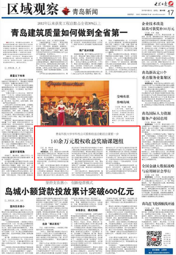 近日,《科技日报》《大众日报》、《中国科学报》网、凤凰网、山东省教育厅网站、《齐鲁晚报》(头条)、《青岛财经日报》《半岛都市报》《青岛晚报》等多家媒体对青科大学科性公司股权收益分配事宜进行了广泛而深入的宣传报道,引起社会强烈关注,进一步提升了学校知名度和美誉度。