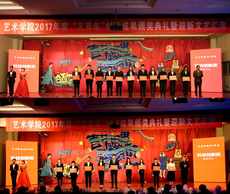 为深入学习贯彻党的十九大精神,树先进典型,展青春朝气,凝聚发展正能量,12月19日晚,以“壹柒相遇.兿起前行”为主题的艺术学院2017年度“艺青年”创新成果颁奖典礼暨迎新文艺汇演在崂山校区第二报告厅举行。校领导王文哲,建安集团、学生处、校团委、艺术学院相关人员及各教研室主任、分团委老师与各年级学生代表800余人共同参加了颁奖典礼并观看了演出。