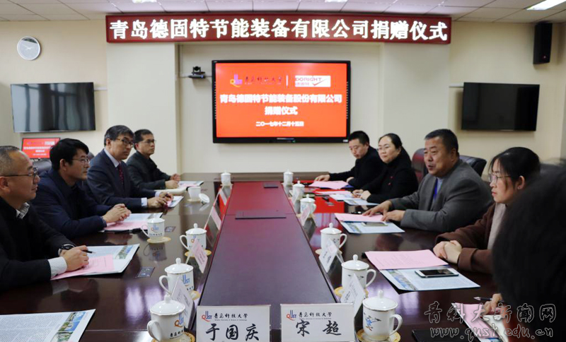 12月15日, 青岛德固特节能装备股份有限公司捐赠及科研合作签约仪式在4008会议室举行,校党委副书记张元利、胶州市科工信局副局长陈吉柱、青岛德固特节能装备有限公司董事长魏振文、副总经理崔建波等出席仪式。