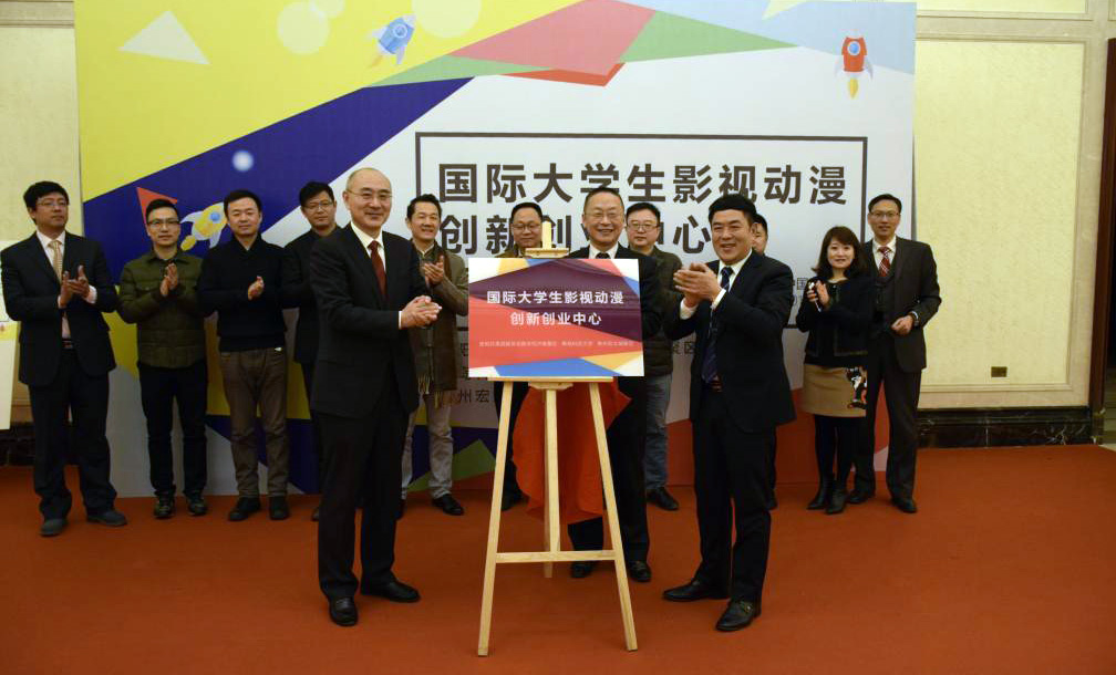 1月6日上午,国际大学生影视动漫创新创业中心揭牌仪式在贵州宏立城集团举行。贵州省政协港澳台侨与外事委员会副主任陈泽明、伟德国际1949官网副校长陈克正、贵州宏立城集团副总裁宿东君共同为国际大学生影视动漫创新创业中心揭牌。