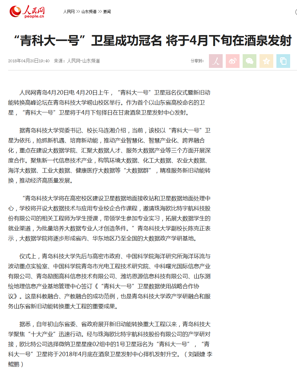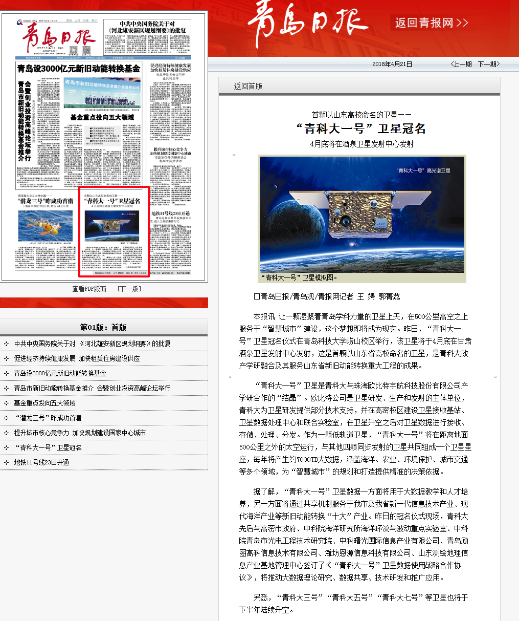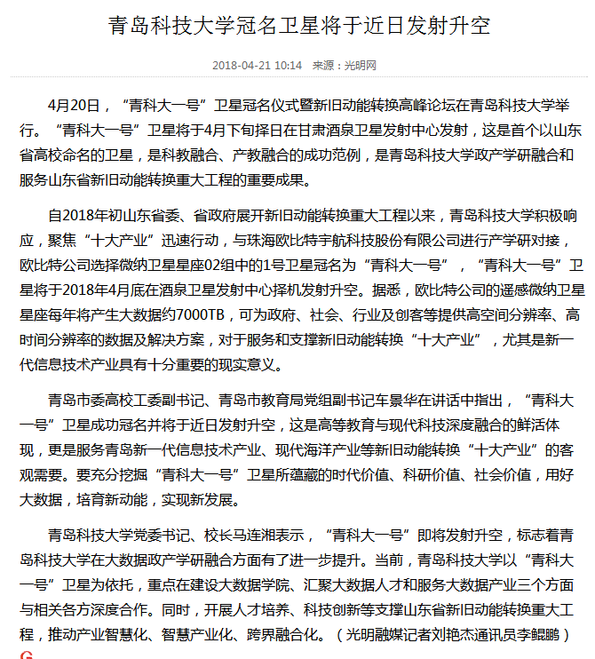 4月20日,“青科大一号”卫星冠名仪式暨新旧动能转换高峰论坛举行。《光明日报》《中国教育报》等十余家媒体应邀参加了仪式。冠名仪式后,人民网、光明网、中国教育新闻网、科学网、凤凰网、《大众日报》、山东教育电视台、青岛电视台、《青岛日报》(头版)、《齐鲁晚报》《半岛都市报》(头条)、《青岛早报》(头条)、《青岛晚报》(头条)、《青岛财经日报》、大众网、新浪网、搜狐网、青岛新闻网(头条)、半岛网等媒体及网站平台进行了全方位深入报道,引起了社会广泛关注,学校美誉度和影响力进一步提升。